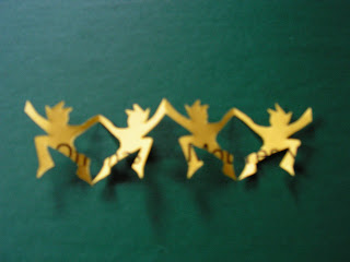 The very first paper dolls I cut were the flame-head dancers (see yellow figures below). Then I branched out. When I cut hands, the pinky fingers are always a little crooked. Now when I go to storytelling conferences, this is what I do during keynote speeches so I can listen. I give the cutouts away because there are always more in my scissors. Many storytellers put them in their nametag holders.